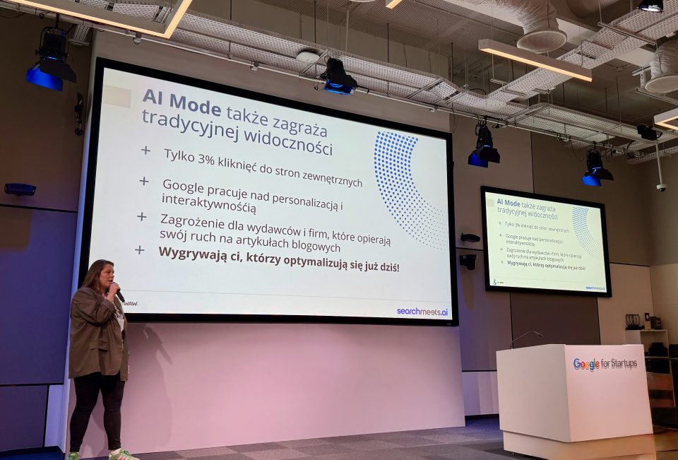 Prelegentka podkreśliła, że AI Overview ma już rosnący udział w globalnych zapytaniach. Wskazała również, że wkrótce po wejściu AI Overview do Polski pojawił się AI Mode – wersja konwersacyjna wyszukiwarki Google. Ten tryb rozbija zapytania użytkownika na mniejsze części, by precyzyjniej odczytać intencję, co dodatkowo obniża ruch wychodzący (zaledwie 3% użytkowników AI Mode klika w linki). Google pracuje nad dalszą personalizacją tego trybu, co stanowi zarówno zagrożenie, jak i szansę dla stron obecnych już dziś w kontekście AI.