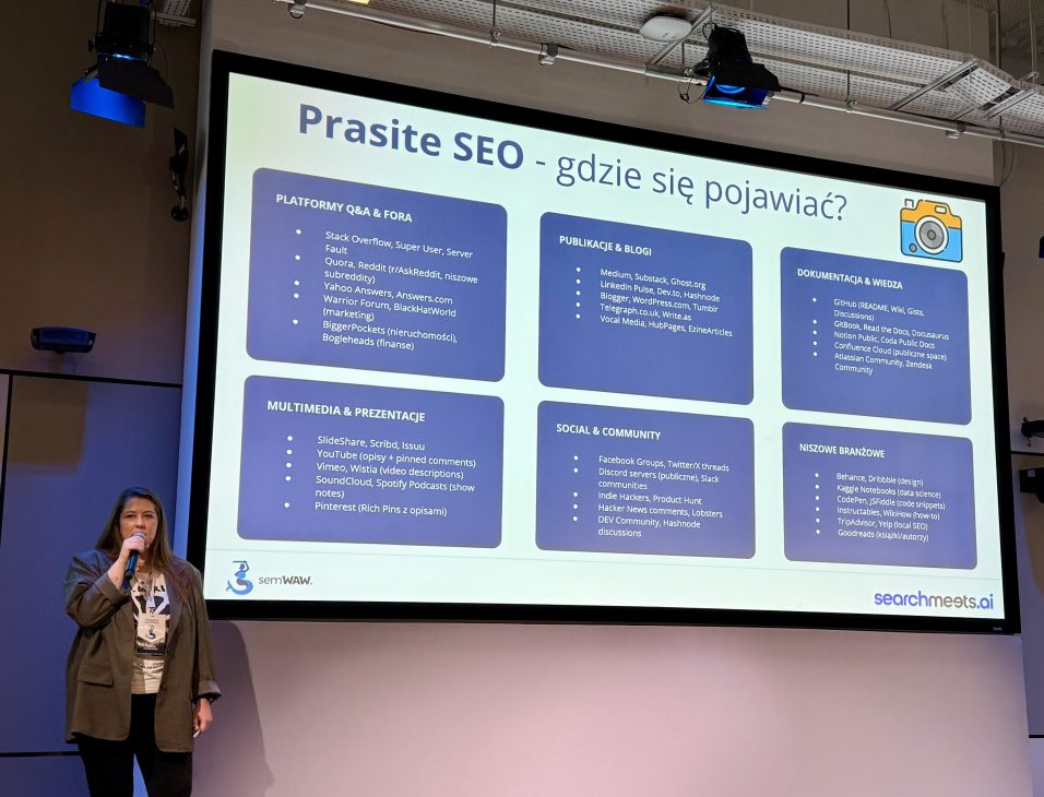 Włączając publikacje w powyższych miejscach do swojej strategii, można znacząco zwiększyć szanse na to, że treści marki zostaną zauważone zarówno przez wyszukiwarkę, jak i modele językowe. Prelegentka podkreśliła, że Parasite SEO szczególnie dobrze działa, gdy łączy się go z wysoką jakością treści, autorytetem eksperckim i regularną aktywnością na wybranych platformach.
