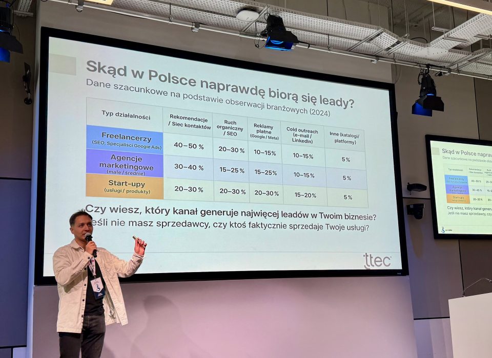 Prelegent zaangażował publiczność, prosząc o wskazanie, skąd w ich biznesach pochodzą leady: reklamy płatne, SEO, outreach czy networking. Zestawił te obserwacje z wynikami badań swojej firmy z 2020 roku, które potwierdziły, że freelancerzy najczęściej pozyskują klientów z rekomendacji, a agencje i startupy z połączenia różnych kanałów.