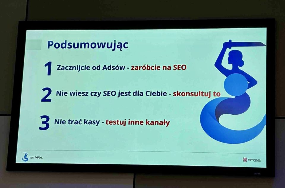 W podsumowaniu części merytorycznej Paweł porównywał tempo działania SEO i kampanii reklamowych. SEO rośnie wolno i jest trudniejsze do zmierzenia, podczas gdy Ads daje wyniki natychmiast. Jednocześnie podkreślał, że oba kanały się uzupełniają – dobre SEO poprawia skuteczność Adsów.