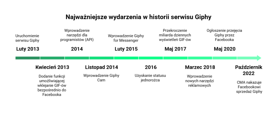 - Maj 2020. Ogłoszenie przejęcia Giphy przez Facebooka za kwotę około 400 milionów dolarów.