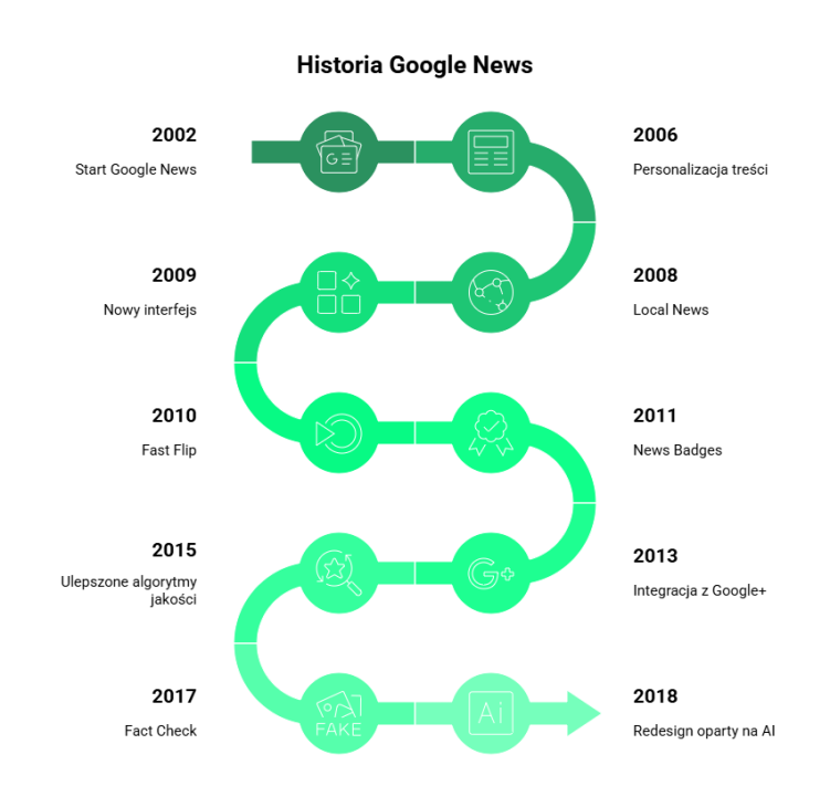 - Maj 2018. Całkowite przeprojektowanie Google News z nowym interfejsem opartym na sztucznej inteligencji, aby lepiej personalizować treści i poprawić doświadczenie użytkownika.