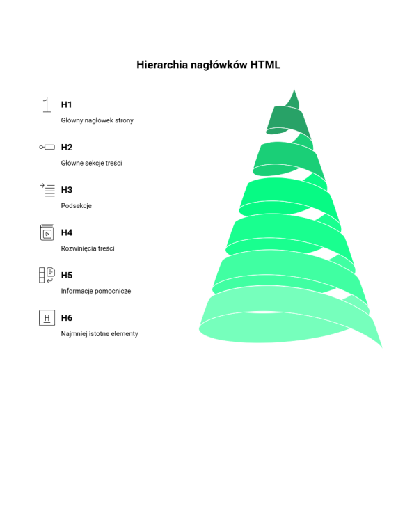 <h1>– nadrzędny nagłówek strony, powinien być użyty tylko raz na stronie i zazwyczaj zawiera główny tytuł lub frazę kluczową.<h2>do<h6>– używane do tworzenia podziału treści na coraz bardziej szczegółowe sekcje i podsekcje. W każdej sekcji powinna zachować się struktura hierarchiczna, gdzie<h2>służy jako tytuł dla głównych sekcji, a dalsze nagłówki jako tytuły dla podsekcji kolejnych poziomów.