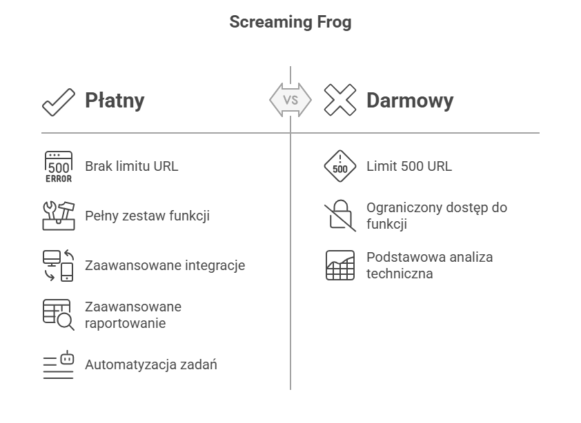 Istnieją dwie główne wersje Screaming Froga: darmowa i płatna. Wersja darmowa ma pewne ograniczenia, takie jak liczba skanowanych adresów URL (limit ten wynosi 500 podstron) czy dostępność niektórych funkcji. Wersja płatna oferuje znacznie więcej możliwości i i nie posiada limitu przeskanowanych adresów.