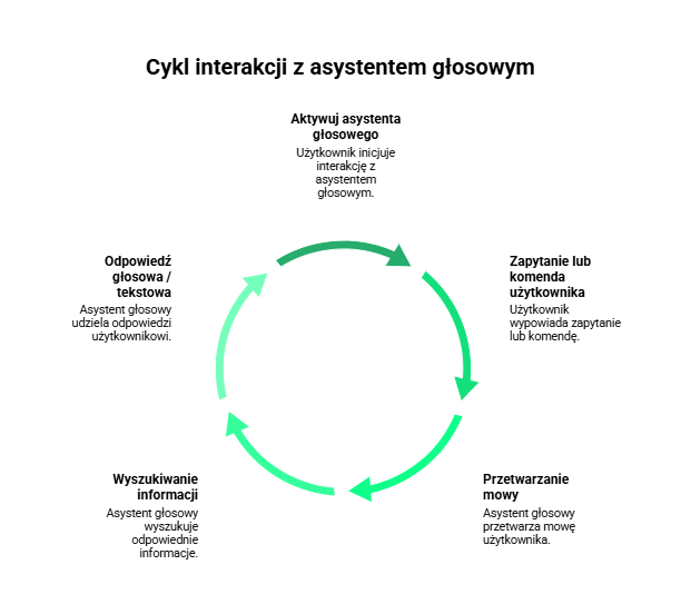 Użytkownik aktywuje asystenta głosowego — takiego jak Google Assistant, Siri czy Alexa — i zadaje pytanie lub wydaje komendę. Asystent przetwarza zapytanie i korzysta z wyszukiwarki internetowej, aby znaleźć najbardziej odpowiednie informacje lub usługi. Wyniki są następnie prezentowane użytkownikowi w formie głosowej, a czasem także tekstowej.
